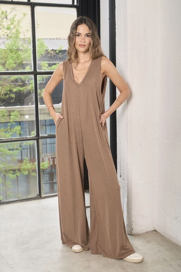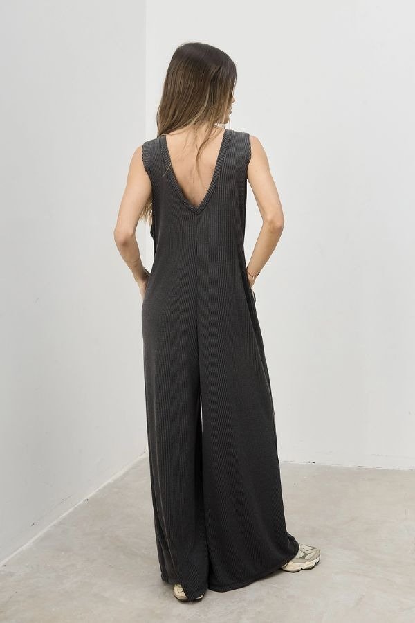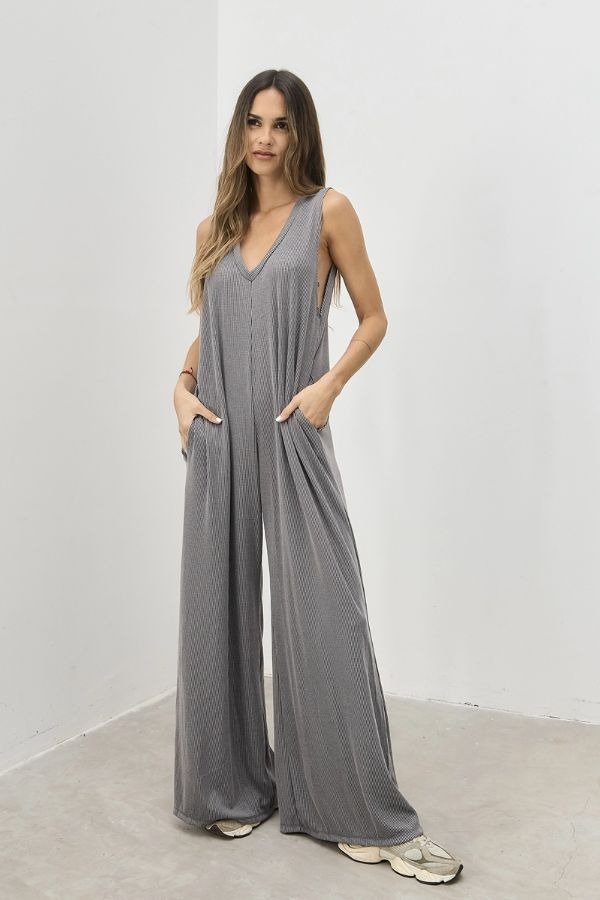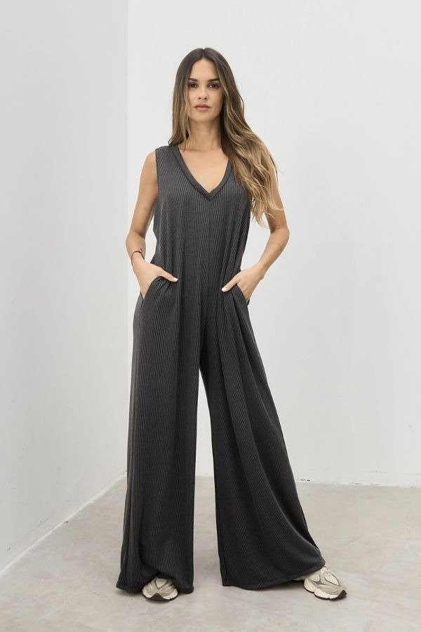 Mono confeccionado en morley kioto, modelo amplio con escote en V en frente y espalda, bolsillo a los costados y piernas anchas.